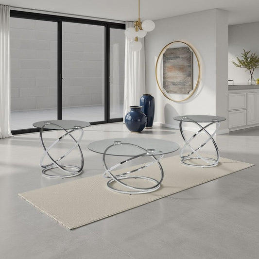 Ashley 3 Piece Conversation Table Set | Glass Top | Metal Ring Base | Clear & Silver