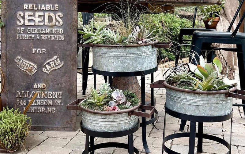 21, 18, and 16 Inch 3 Piece Round Tub Metal Planter Set with Stand in Galvanized Gray and Black Iron By The Urban Port