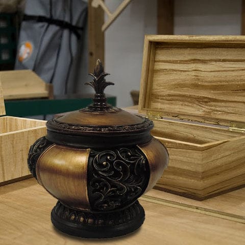An urn shaped beautiful traditional decorative box accented with golden carving and black colored base. This lidded jar is designed according to the old-time evergreen fashion. The black and golden finish is blended into each other very beautifully which highlights its traditional style. Makes an ideal piece for storing and decorative purpose. The designer lidded top provides a good grip for opening. Floral print at the middle part makes it look classic and attractive in appeal.