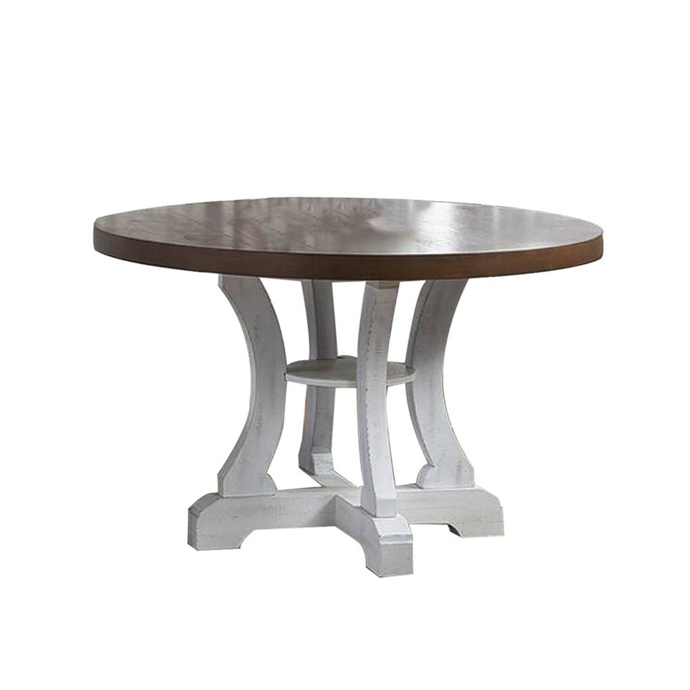 Beautifully designed to accentuate any modern or transitional dining room, this round dining table instantly makes any room functional and stylish. The spacious tabletop holds meals with a graceful appearance while the classic style pedestal base and distressed brown and white finish bring a timeless old world charm to any interior decor style. Check out our Neci collection for more options.