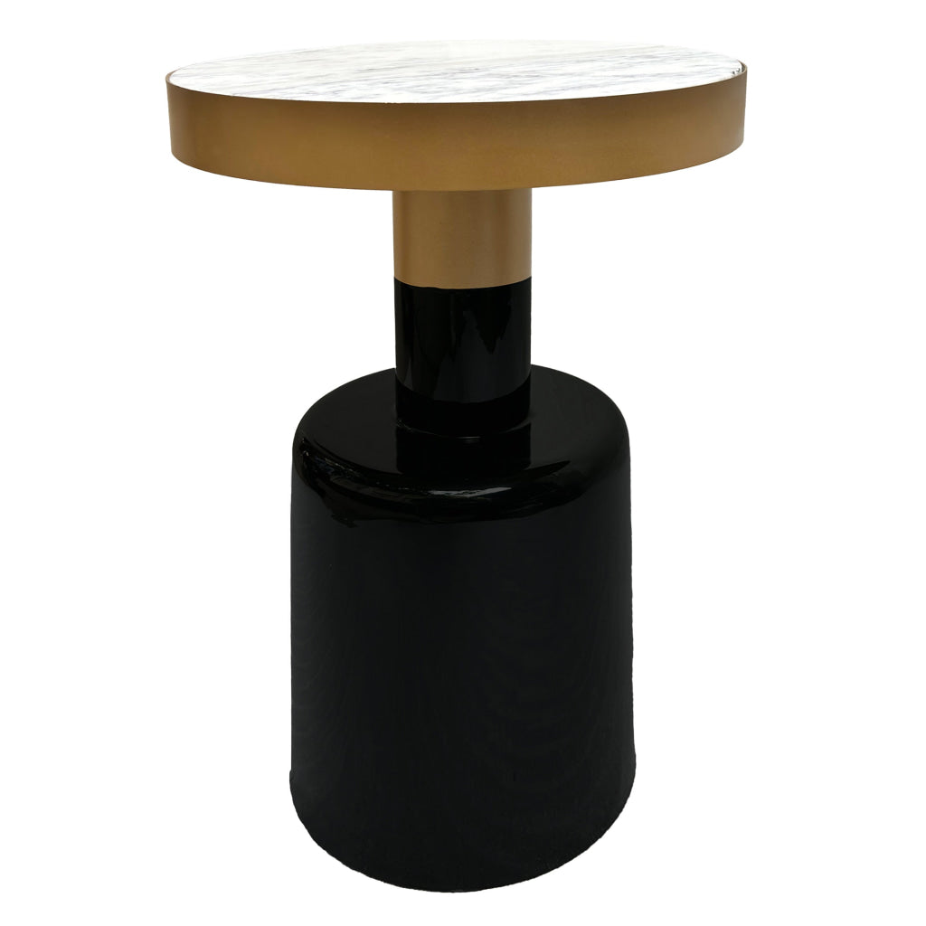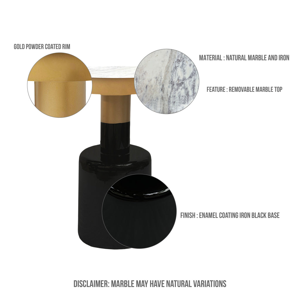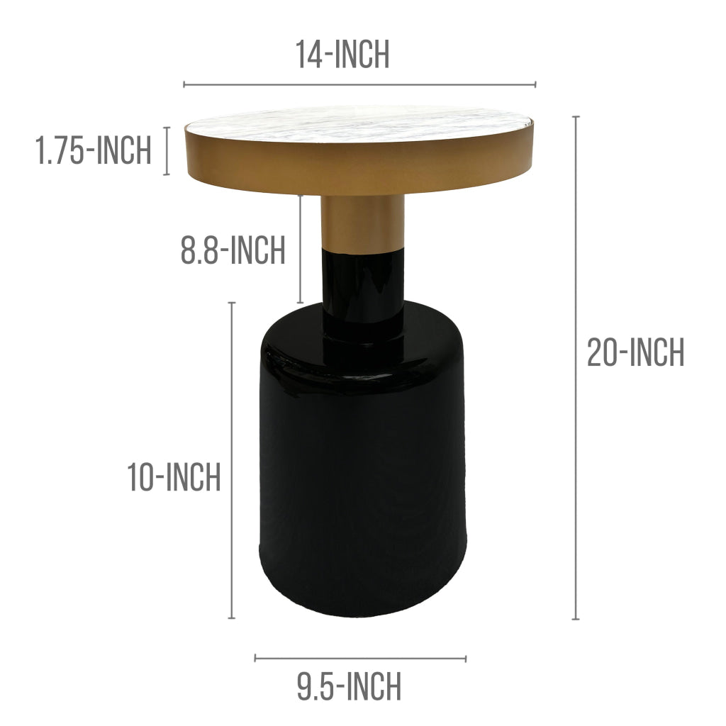 This elegant, eye-catching decorative round side end table provides the perfect spot to rest cocktails or appetizers during your weekend get-togethers and family gatherings. Showcasing a modern style and handcrafted from iron, this unique, one-of-a-kind piece boasts lasting durability and outstanding balance. It features a stylized black enamel-coated cylindrical pedestal base, finished with a round marble top that offers plenty of room to eat and enjoy conversations on any evening out of the week. It also adds a bold, modern look to any living room or lounge area and can be pulled up against an armchair for the perfect accompaniment. Use this round side end table alongside a sofa or in a freestanding placement anywhere for an instant upgrade to the class and style of your social space.