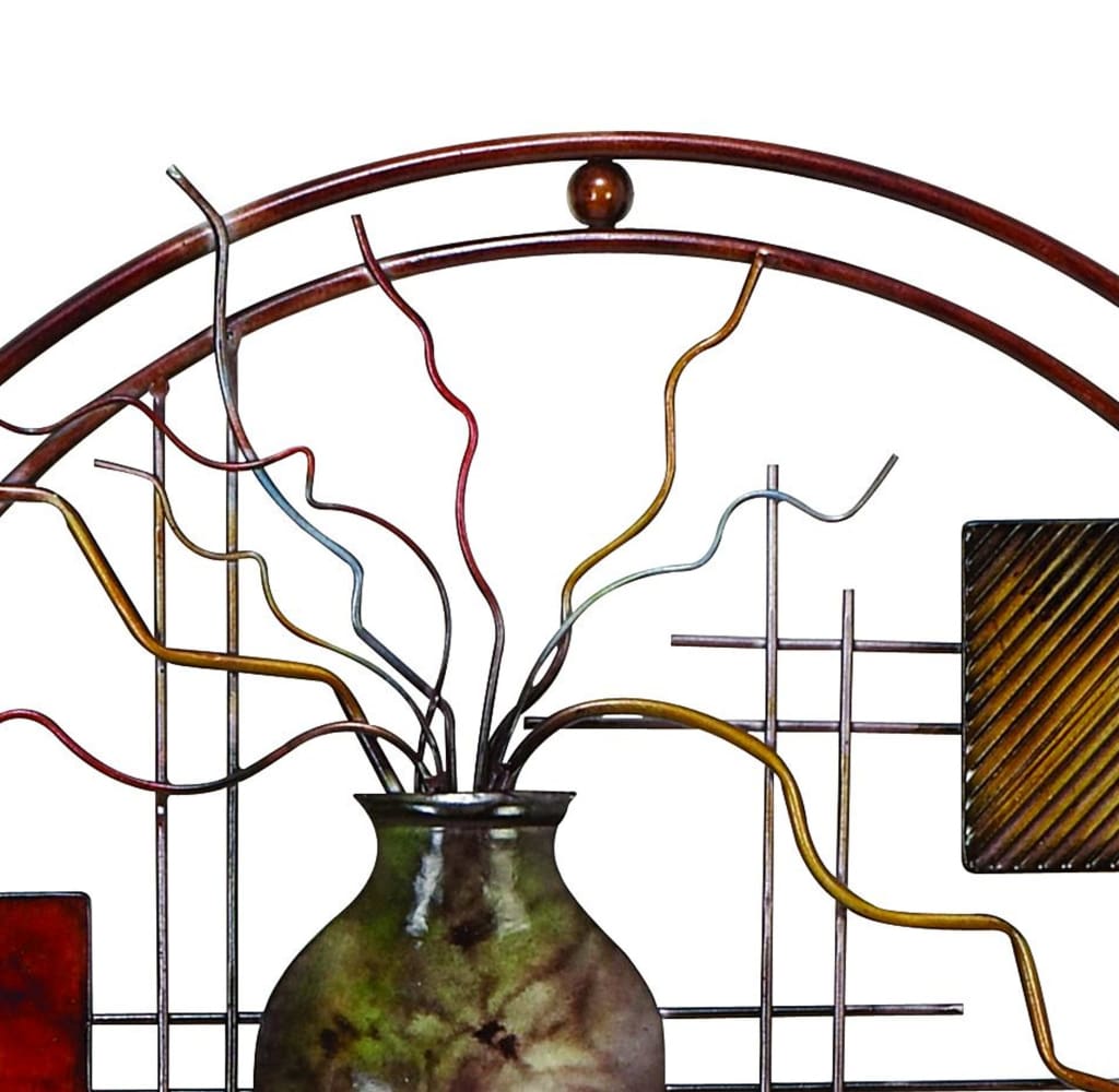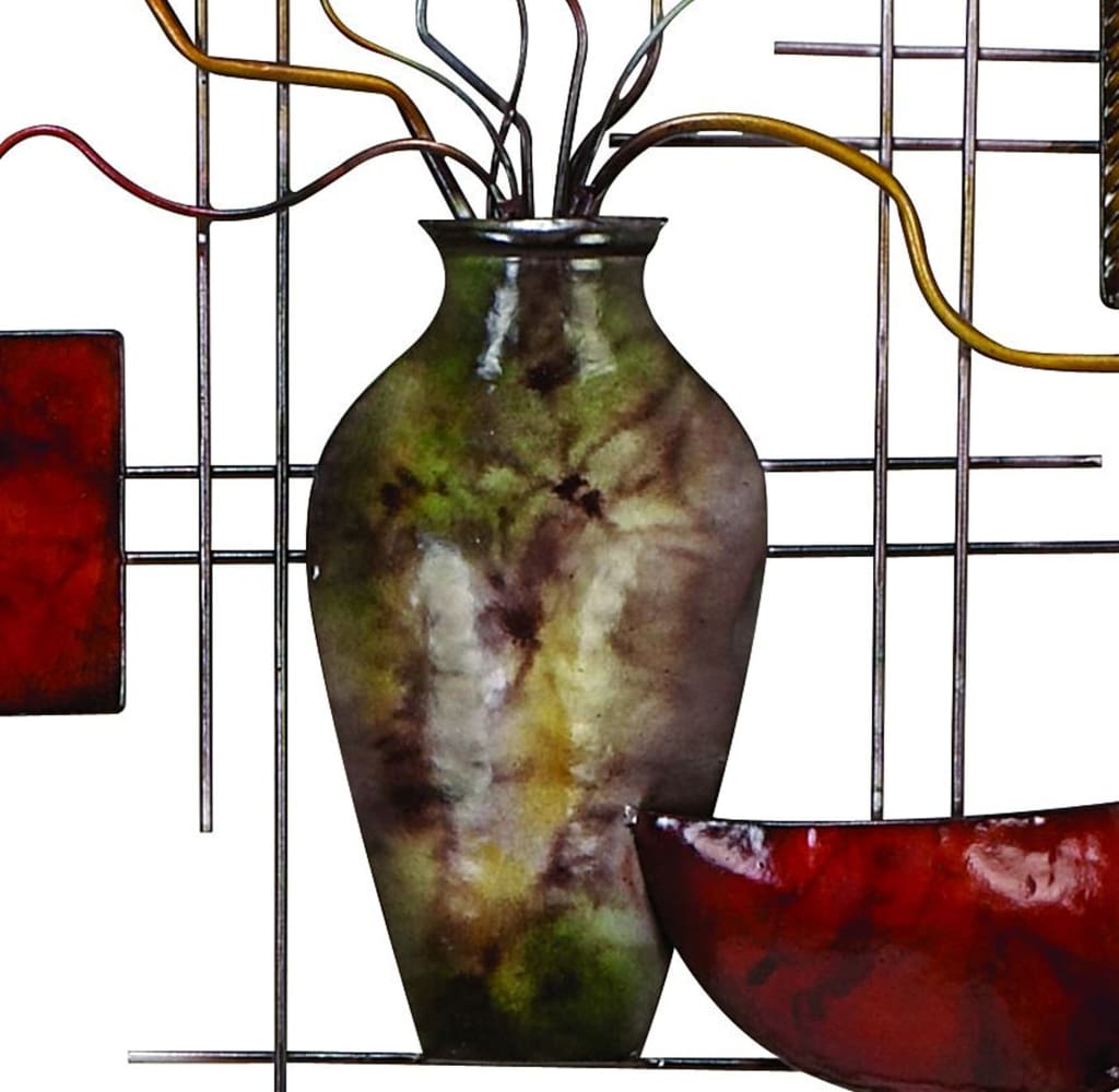 Express your love for contemporary artistic expression with this distinctive round Metal Vase Wall Decor. Made up of rust-free premium grade metal alloy, this enticing design showcases vases, bowls, and other abstract geometric shapes in red, green, brown, orange, and yellow creating a three-dimensional appearance. This wall decor can easily be hanged with the hooks provided on the back at the top and bottom.