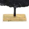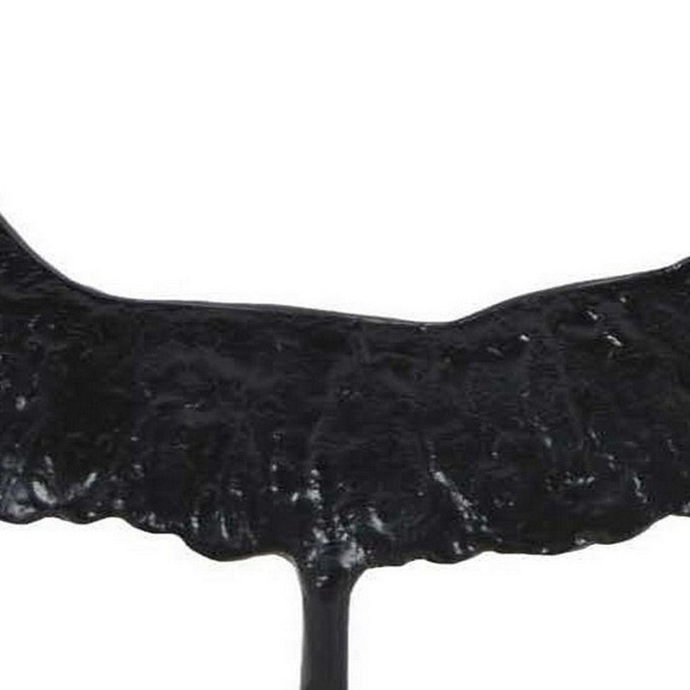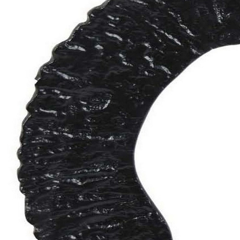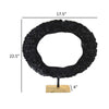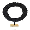 Description:This elegant contemporary tabletop decoration is a striking blend of modern design and rustic charm, crafted from durable metal in a sleek black finish. Its round shape, accentuated by irregular edges, adds a touch of uniqueness and character to any surface it adorns. Resting atop a sturdy brown wood base, the juxtaposition of materials creates a captivating visual contrast.