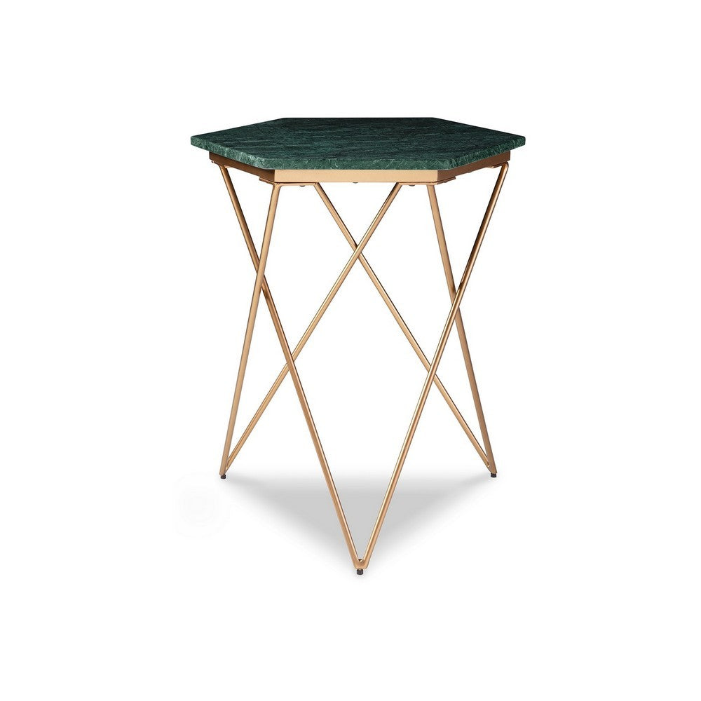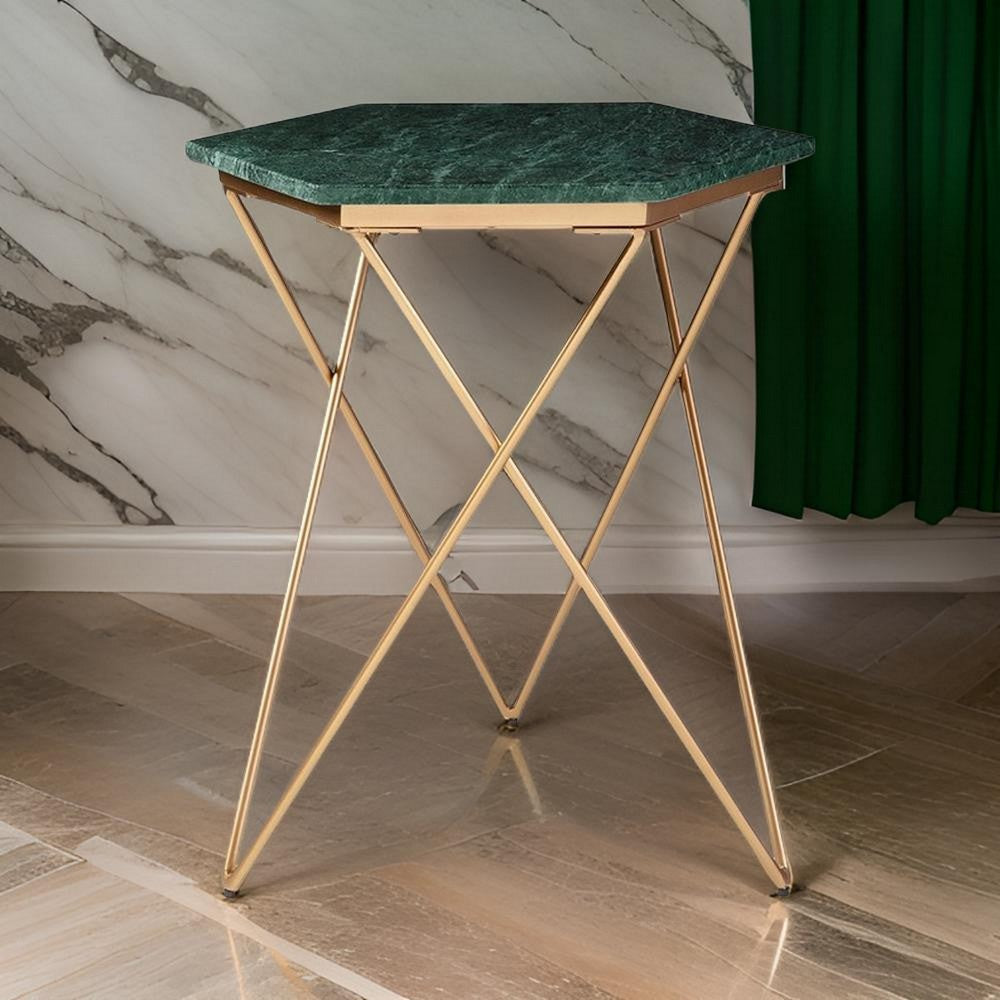 This accent side end table in gorgeous green and gold tones is a stylish addition to your living room, lounge, or foyer. With a sturdy metal frame in a charming gold tone finish, it showcases a hexagon shaped green marble top for a touch of unique elegance. The triangular geometric design of the legs adds a modern touch, making it a functional and eye-catching piece for your interior decor.