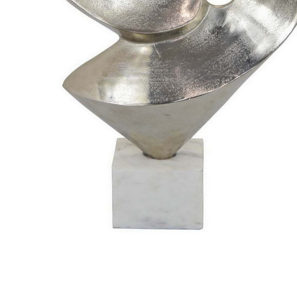 This modern art tabletop sculpture is a unique piece of home decor to elevate your interior theme. Crafted from robust metal in a chrome finish, it effortlessly adds a touch of modern-style luxury to your living space. This sculpture is fitted to the square block base to provide stability as it seamlessly blends with the style of any office, home, or foyer.