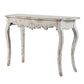 - Distressed white finish and decorative scrollwork gives the piece a vintage inspired look46L x 16.5W x 30H, in inches