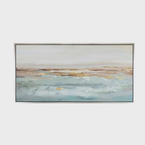 • Canvas watercolor oil painting depicting a multicolor rectangular landscape of an abstract ocean