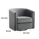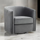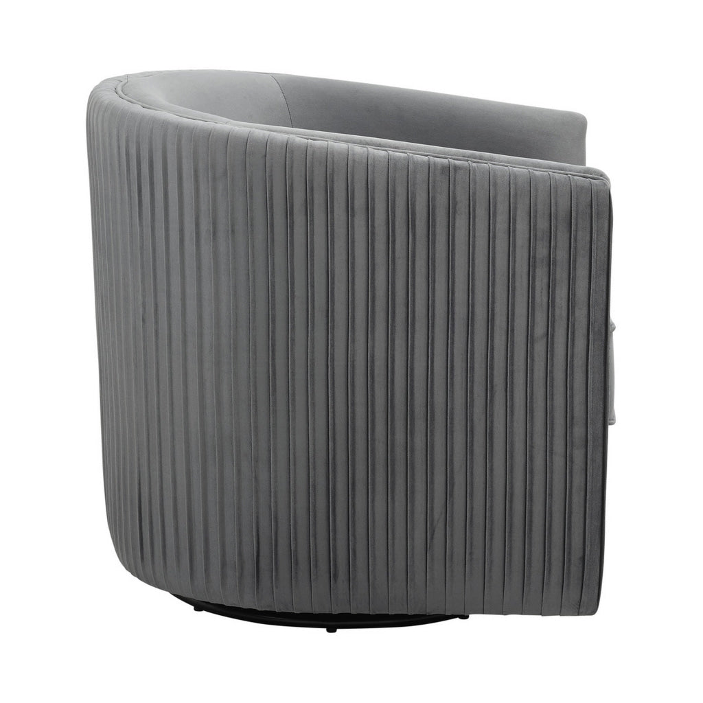 Allow our modern contemporary style swivel accent chair to envelop you in supreme comfort. This luxurious home accessory features soft gray velvet upholstery, contoured tuxedo arms, attached back and reversible seat cushions, and a removable seat cushion cover with a zipper for easy cleaning. Last but not least, it has a smooth 360 degree swivel functionality and stylish pleated details.