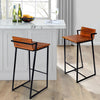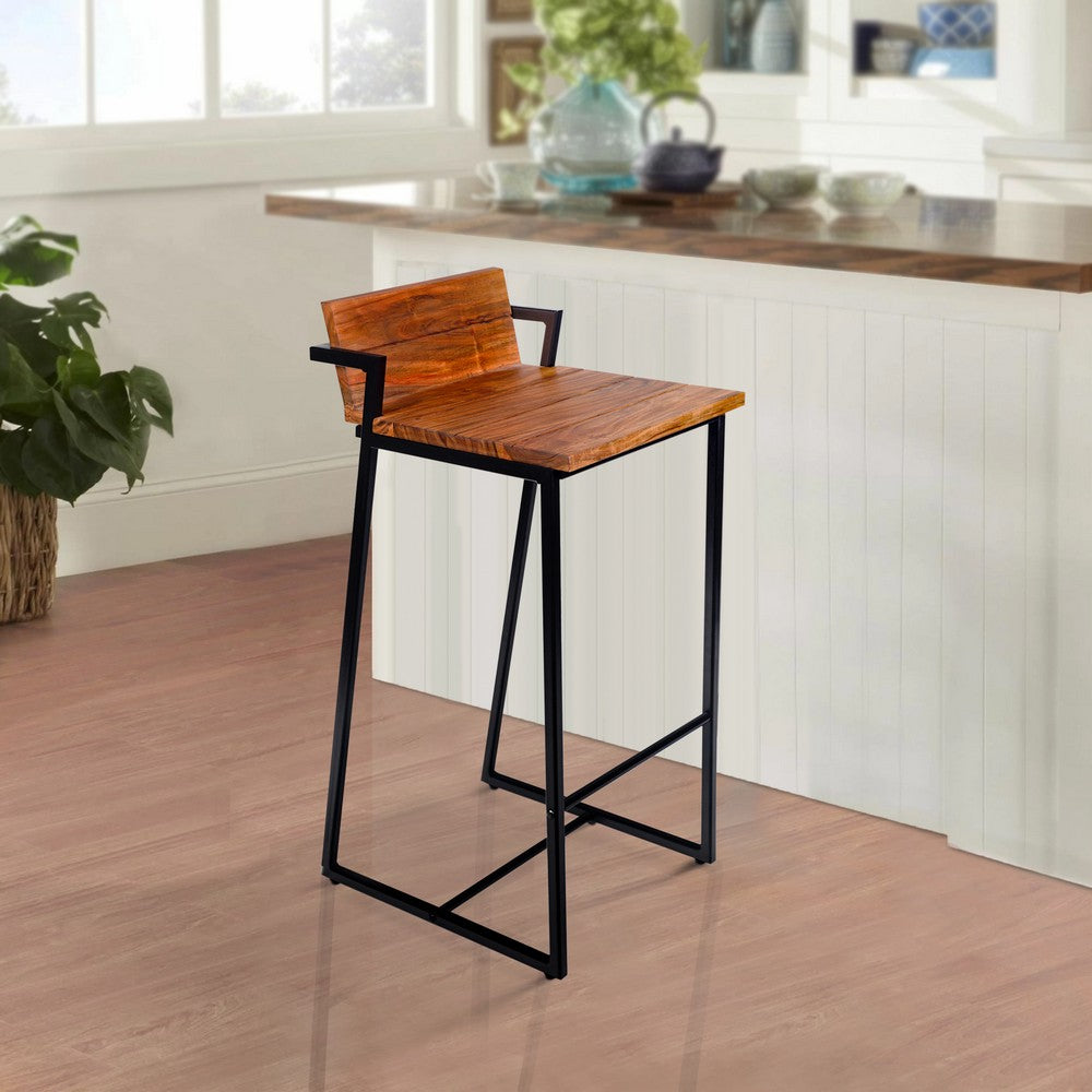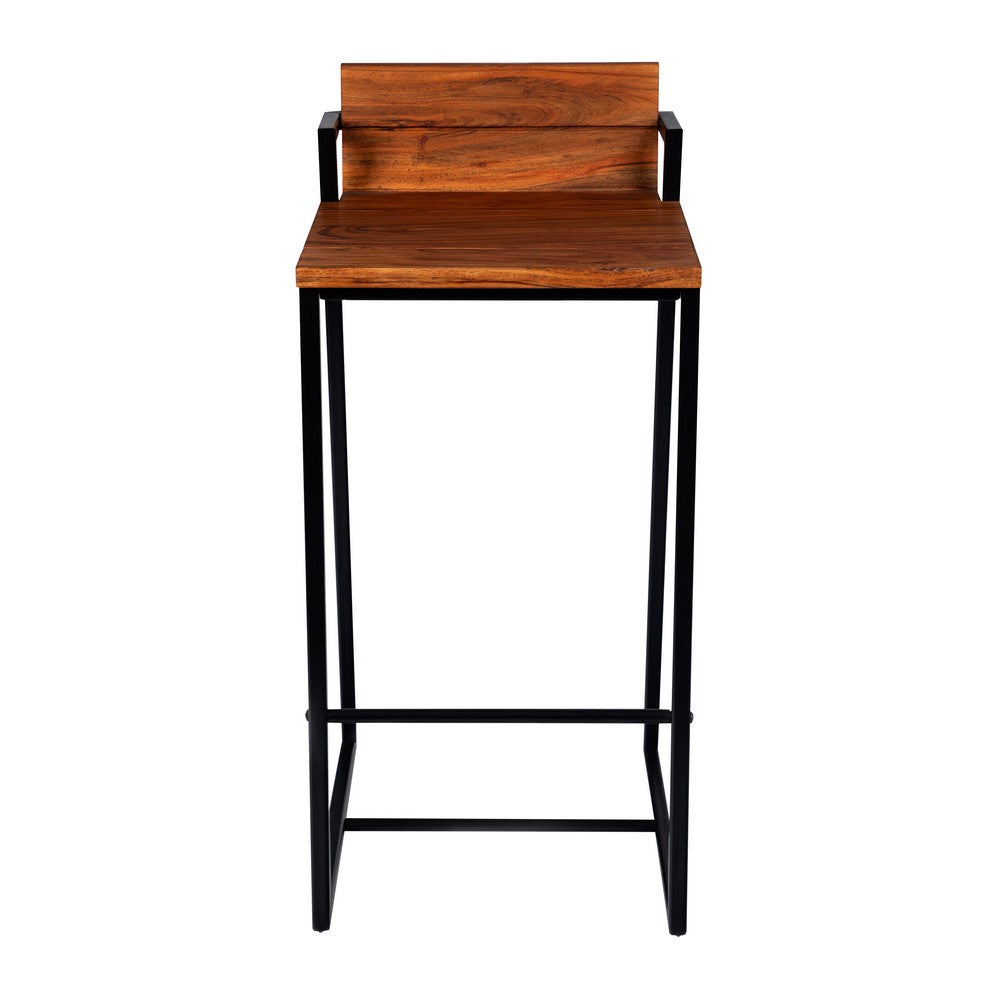 Impart a powerful industrial flair to your bar space with the introduction of this exquisitely designed barstool. This handcrafted, custom designed piece features wood grain details for a natural appeal, and the seat features a low backrest for all the freedom of a barstool but just enough chair support to slightly guide your posture when fully seated. This stool is handcrafted from the combination of acacia wood and metal for lasting durability, and the warm brown accented wood is a perfect contrast to the black powder coated metal frame. The horizontal support doubles as a footrest, bringing additional comfort and convenience to this piece. Designed with precision and style, this barstool blends seamlessly with a range of styles, from traditional to contemporary, while still standing out with its own unique personality.