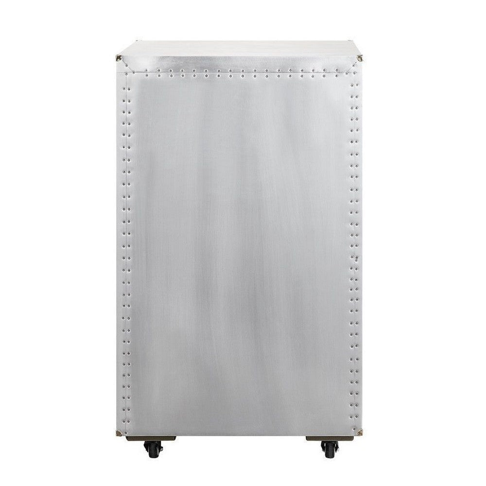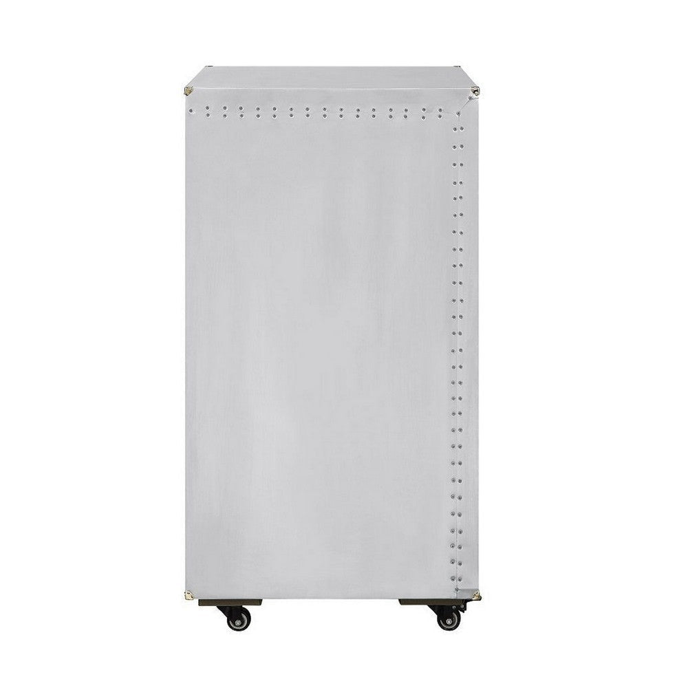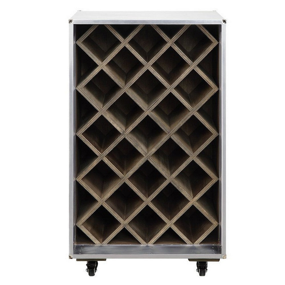 This wine cabinet is a sleek and functional furniture piece that lets you store and display your wine collection with style. It is made of high quality wood and durable composite wood, all with an aluminum outer finish that gives it a modern, industrial look. The cabinet has ample capacity and stylish nailhead trim on the edges. It is complete with caster wheels that allow you to roll it easily.