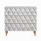 Elevate your bedroom setup with this wide dresser. Its geometric design adds a contemporary touch with an eye-catching metallic silver hue. It features three spacious drawers for storing essentials, a top drawer, and a removable jewelry tray. The tapered legs and acrylic drawer knobs with champagne accents enhance its shine and sophistication, making it perfect for any stylish home.