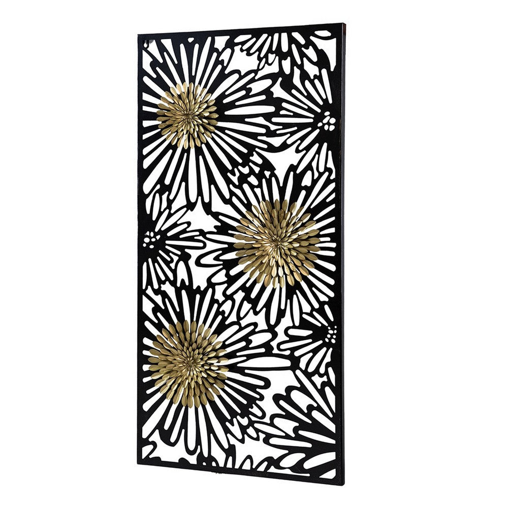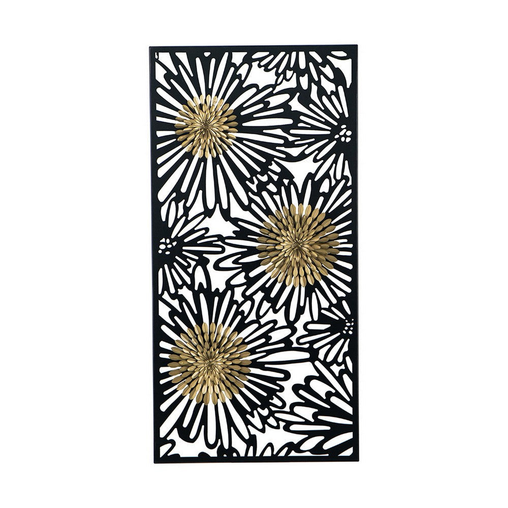 This tall rectangular hanging decorative wall art piece creates a focal point with a floral motif. Made from high quality iron, this piece features an enticing gold and black finish and a white background. A flower bloom design adds a touch of sophistication and elegance to your wall that makes it ideal for a wide variety of rooms and interior home decor styles.