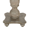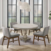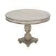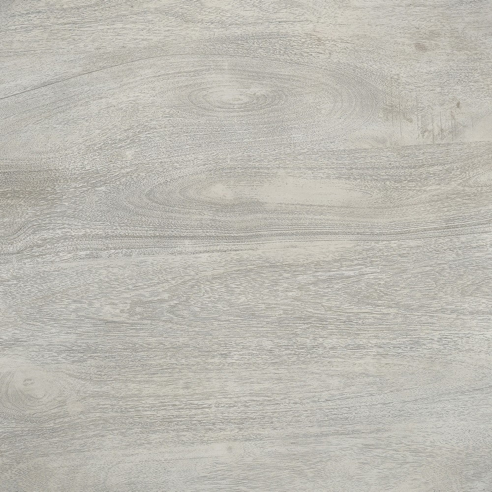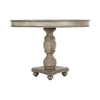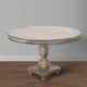 Enrich your family dining room with our classical farmhouse inspired round wooden dining table in a washed white and gray accented finish. Depicting expert level craftsmanship with a carved, turned design on the frame, this elegant table has a clean round silhouette with gorgeous wood grain details for a sophisticated, warm look. Handcrafted from a premium quality mango wood frame for enhanced durability and smoothness, the turned pedestal with a four point base brings perfectly balanced stability while enjoying a meal at home. An intriguing, unique fit for any dining area from traditional to transitional, this table stands out amid a wide variety of decor.