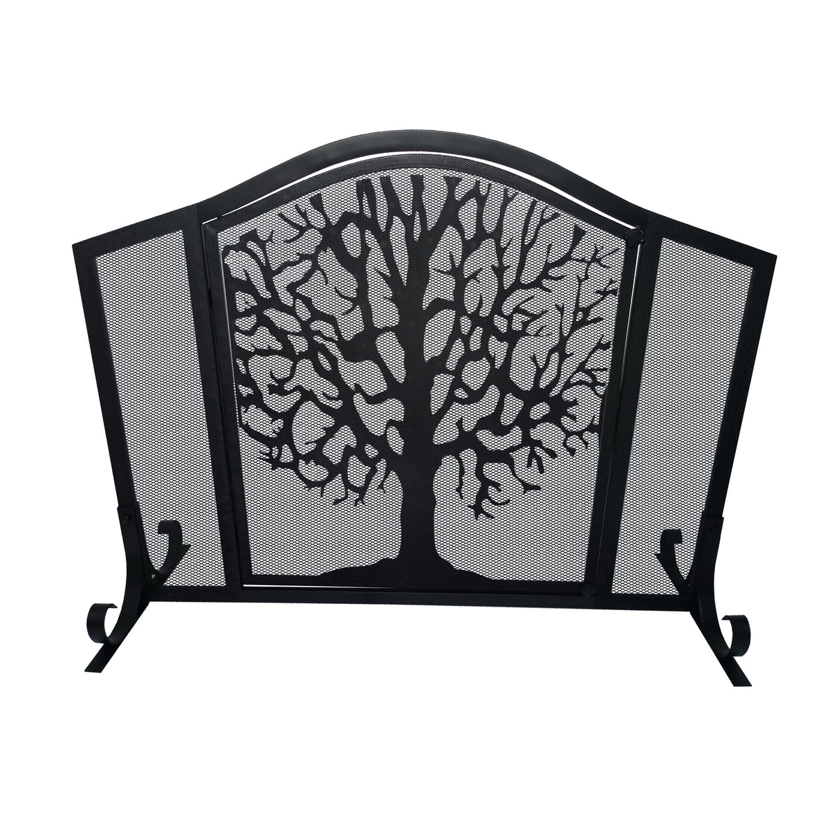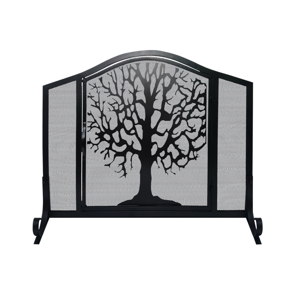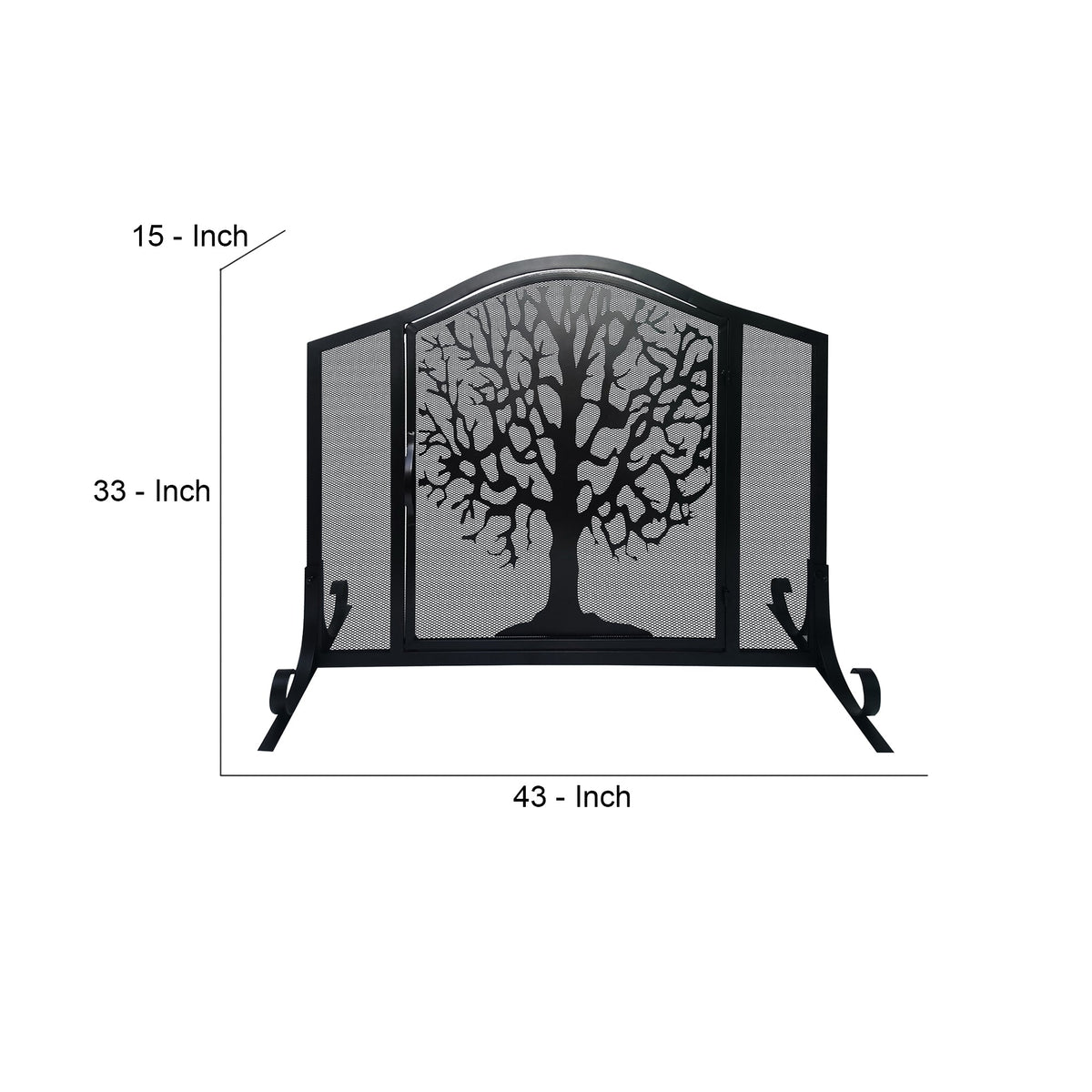 Expertly crafted, this fireplace screen is designed to keep your home and your loved ones safe while relaxing in the family fireplace room or lounge. The three panel design with mesh helps to shield excessive heat or reduce embers coming from the fireplace to provide a warm and safe evening. It also protects you and your kids by reducing any potential damage or expulsions caused by the fire. Handcrafted from a lightweight yet sturdy iron frame in black powder coated finish, it has an arched style top and a center door panel that depicts a gorgeous art display of the tree of life. This fireplace screen is supported on a stable frame with an elegant scrollwork at the base for added style.Shipping Information: