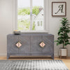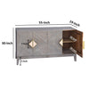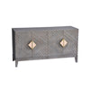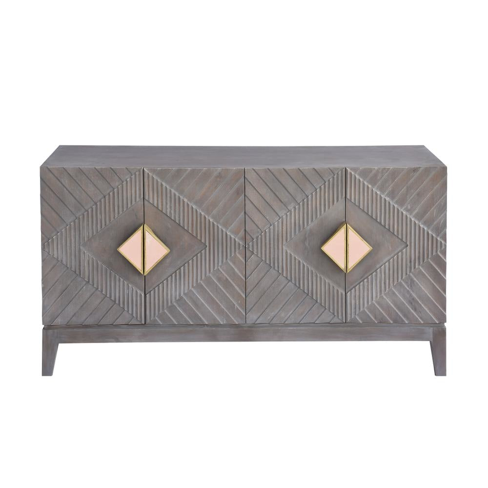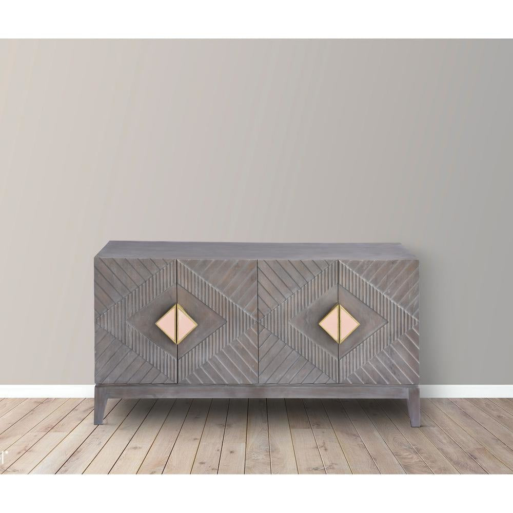Depicting an artisanal diamond carved design, this mango wood sideboard buffet cabinet from our best-selling Abiel collection perfectly fits your dining room, foyer, kitchen, or living room. Expertly handcrafted from durable mango wood in a vintage gray finish and composite wood back panel, this piece has sandblasted wood handles in gold finish with white epoxy resin accents for a distinguished aesthetic charm. Featuring four soft-closing doors, each cabinet opens to reveal a storage shelf to keep utensils, table linens, jars, containers, and more. Supported on block tapered legs, this sideboard cabinet blends with various decor styles, such as traditional, transitional, rustic, cottage, or modern and contemporary. The wide rectangular top offers plenty of space to showcase your hand-curated decorations, kitchen accent items and appliances, lamps, vases with flowers, and more. Check out our Abiel collection for more color options.