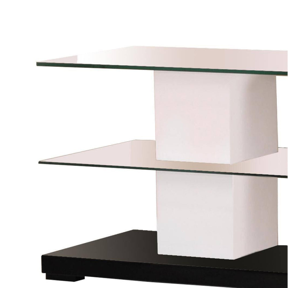 This TV Stand impresses with stunning, contemporary looks, it will be an impressive focal point in your living room. Features black and white finish, with clear tempered glass shelves complementing the set. Its open storage shelving offers plenty of space to keep your entertainment components. Stylish sleek design and practicality go hand-in-hand with this TV stand.