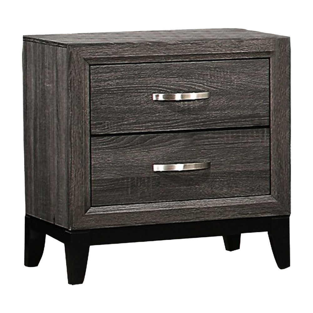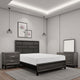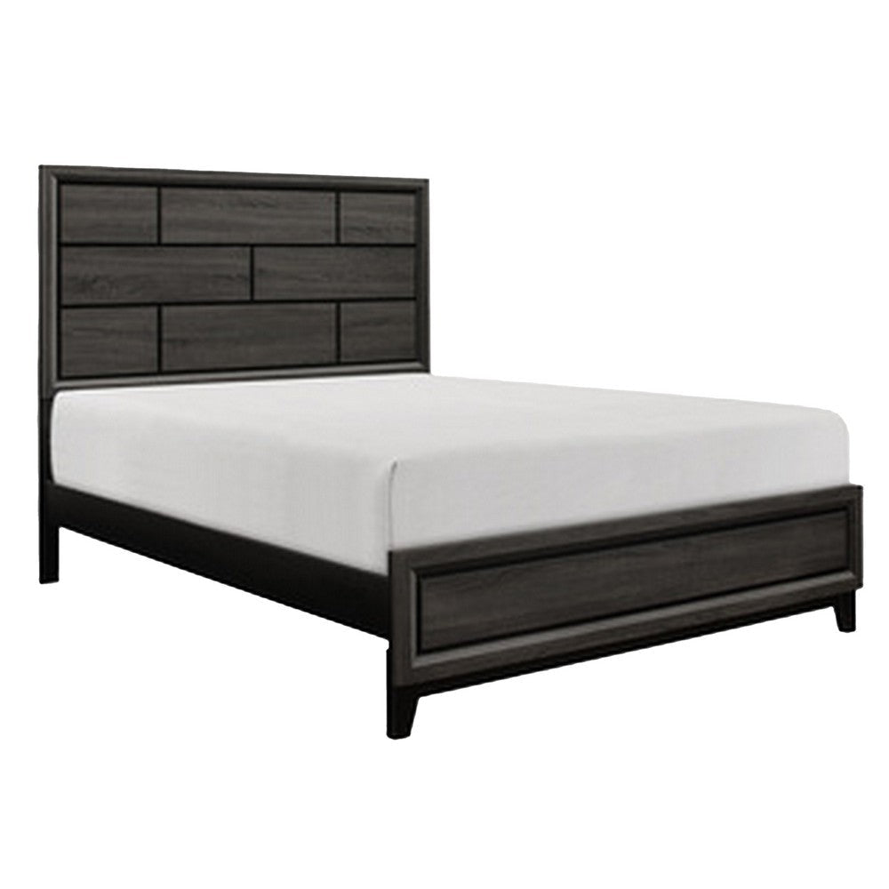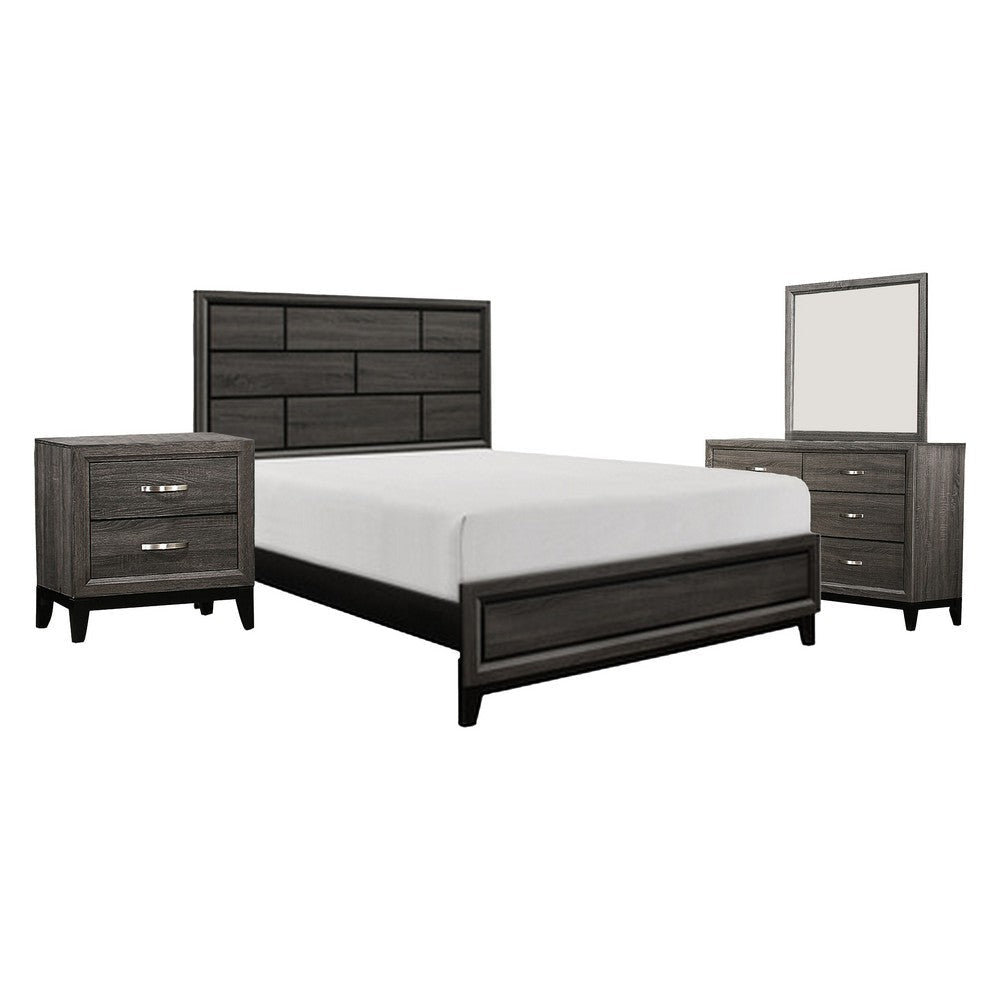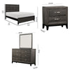 Elevate your bedroom into a stunning and functional sanctuary with this four-piece bedroom set. Crafted from wood and supported by resilient metal legs, it features a queen bed with brick pattern headboard, a two-drawer nightstand, a six-drawer dresser, and a square mirror. The dark gray finish shines with printed grains. With ample storage space, this set invites you to elegantly display your bedtime essentials and cherished decorative items.