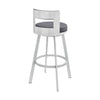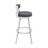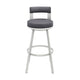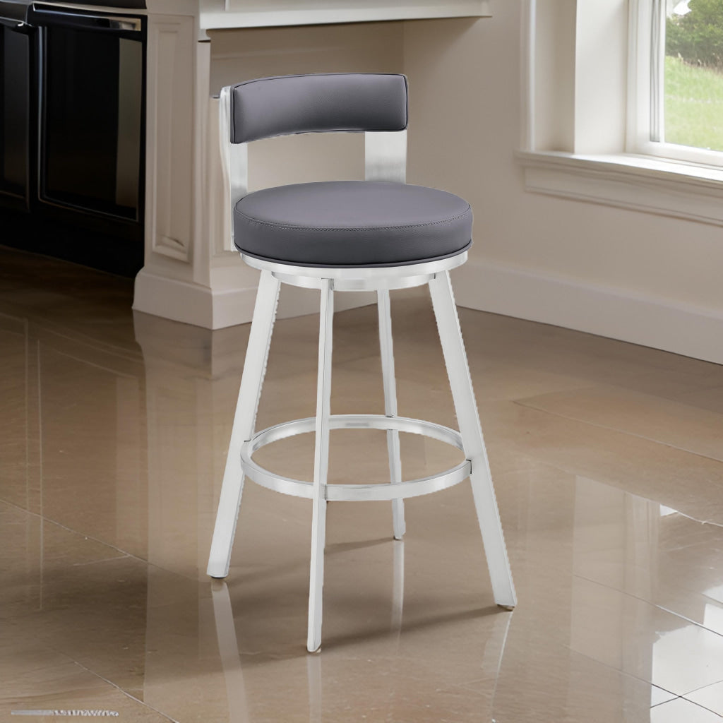 Description:Our Ami swivel barstool chair is meticulously crafted with brushed chrome iron for a style that seamlessly integrates with modern interiors. The gray vegan faux leather upholstery not only enhances comfort, but adds a touch of sophistication with a curved open style back for support and a visually appealing silhouette. Check out our Ami collection for more options.