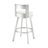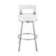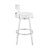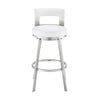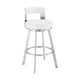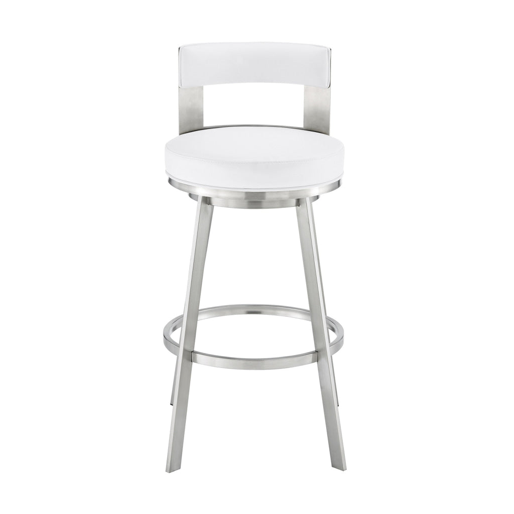 Description:Our Ami swivel barstool chair is meticulously crafted with brushed stainless steel for a style that seamlessly integrates with modern interiors. The white vegan faux leather upholstery not only enhances comfort, but adds a touch of sophistication with a curved open style back for support and a visually appealing silhouette. Check out our Ami collection for more options.
