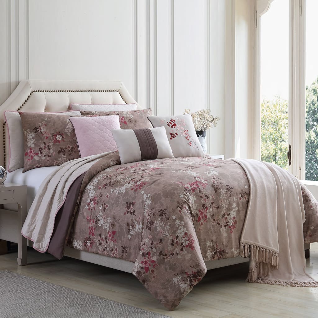 Andria Bed Set | 10 Piece Queen | Comforter & Coverlet | Brown & Pink
