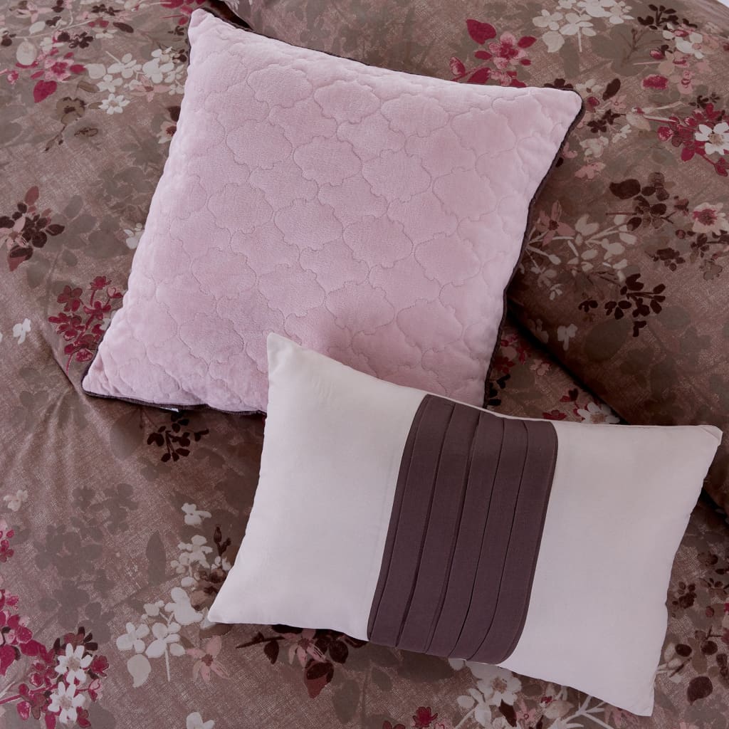 Create a luxurious bedroom look with this 10 piece queen size reversible comforter and coverlet set, crafted using microfiber that offers a great comfort. It includes comforter, quilted coverlet, 4 shams, 3 decorative pillows and throw whereas the comforter is reversible and styled in a beautiful flower print with the blend of pink and brown color while the quatrefoil quilted stitching on reversible coverlet adds to its glory.