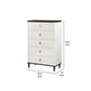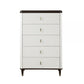 Elevate your bedroom ambiance with this gorgeously crafted tall dresser chest, an exquisite fusion of style and functionality. Its refreshing white and brown finish exudes charm while the five spacious drawers facilitate seamless organization. The wooden legs come adorned with metal caps for durability and stunning visual contrast. Check out our Aren collection for matching items.
