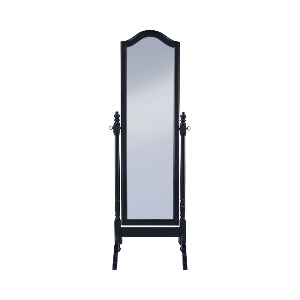 You'll have a beautiful accent for your home decor with this cheval mirror. The piece carries a rich Black finish and features a tilting long mirror, which allows you to obtain the angle you want. Plus, the gently arched top as well as short finial side posts create a regal appearance. Simply stunning, this cheval mirror will make a great addition to your living area, entryway or bedroom.