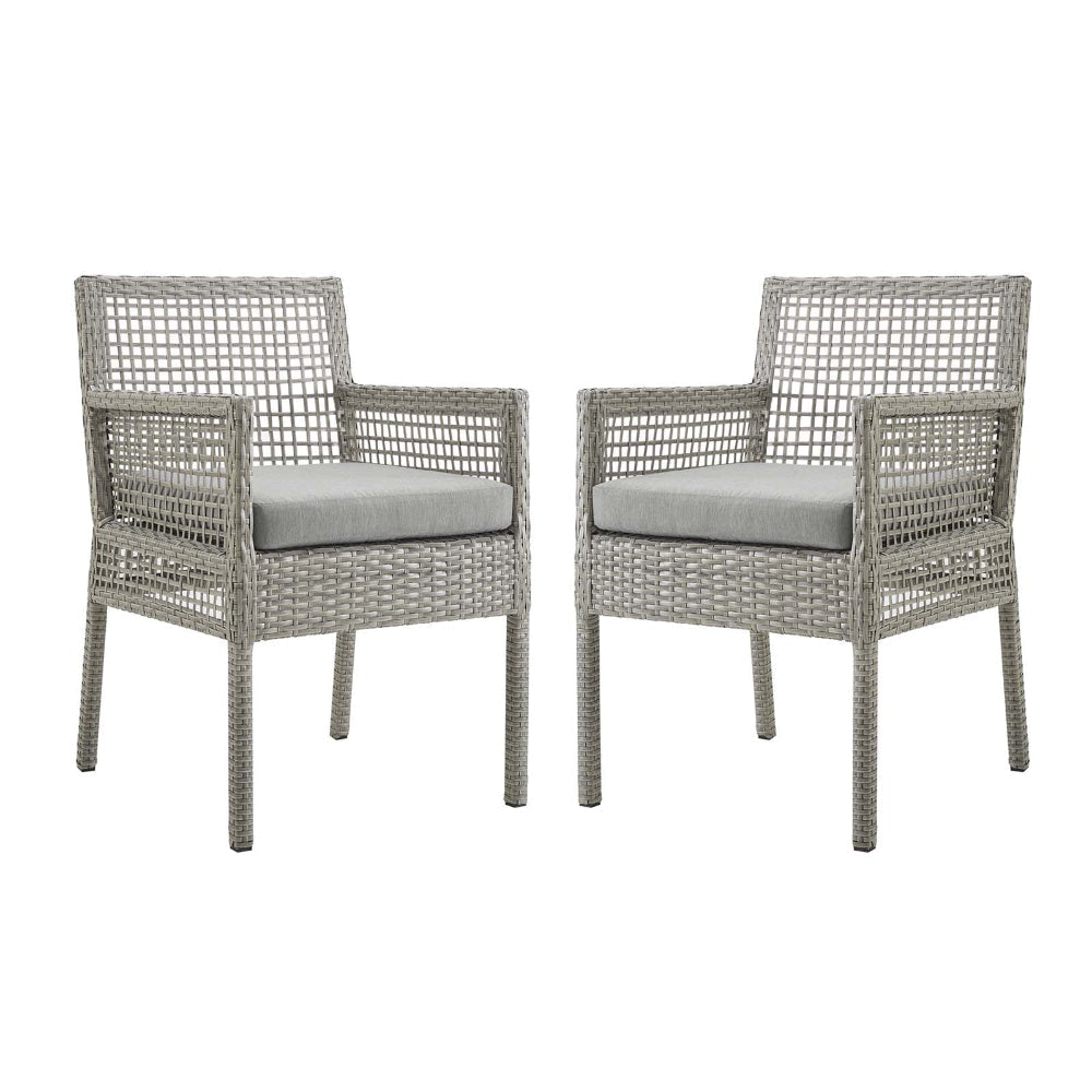 Weave conversational threads into a rollicking good time with Aura Outdoor Patio Dining Arm Chair. Aura is an outdoor dining chair that comes with a synthetic gray-on-gray tone wicker rattan weave and a powder-coated aluminum frame that delivers a softly versatile outdoor collection that shifts to meet the needs of the moment. Outfitted with a machine washable and fade resistant all-weather fabric cushion, Aura Patio Dining Chair will make your outdoor spot the focal point of good memories and festive gatherings while enhancing your patio, backyard or poolside arena. Complete with non-marking foot caps, enjoy spacious seating and enhanced comfort with this reliable piece of outdoor furniture. Set Includes: Two - Aura Dining Armchair