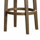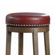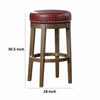 Modern comfort meets timeless style with this set of two swivel bar height stools, featuring a plush round seat upholstered in luxurious red faux leather. Meanwhile, its sturdy brown wood base with a footrest offers stability and an effortless 360 degree swivel functionality, all adorned with nailhead trim to complete the transitional design. Check out our Bara collection for more color and size options.