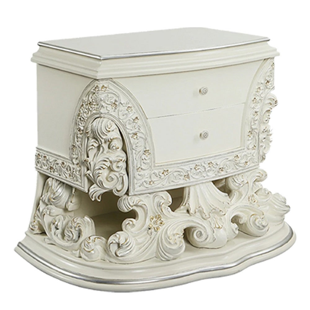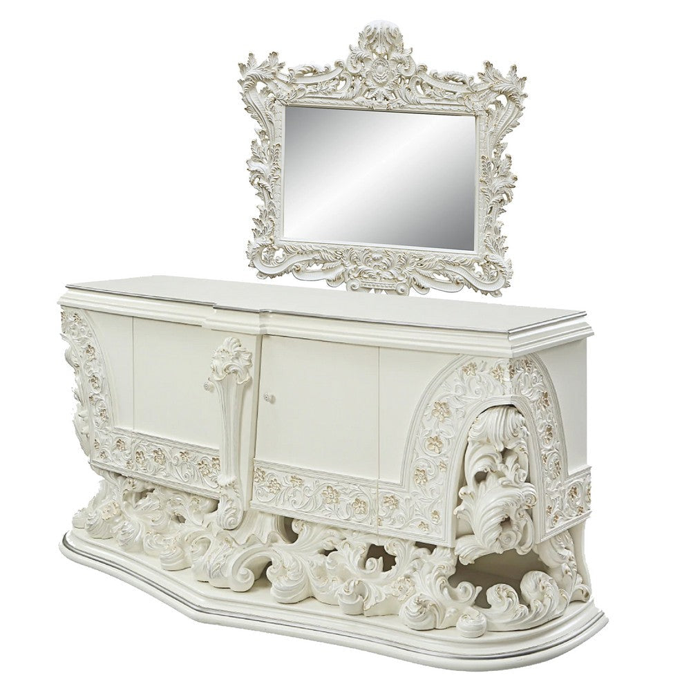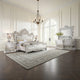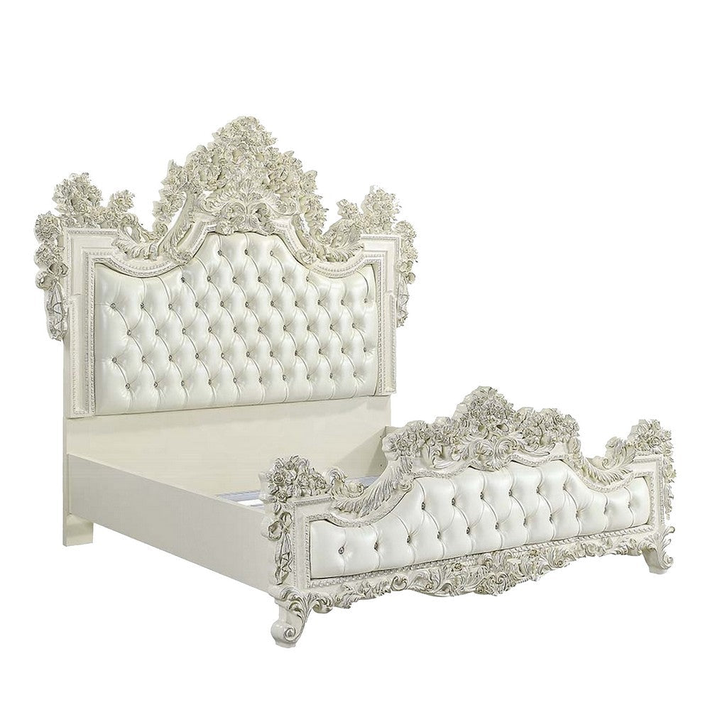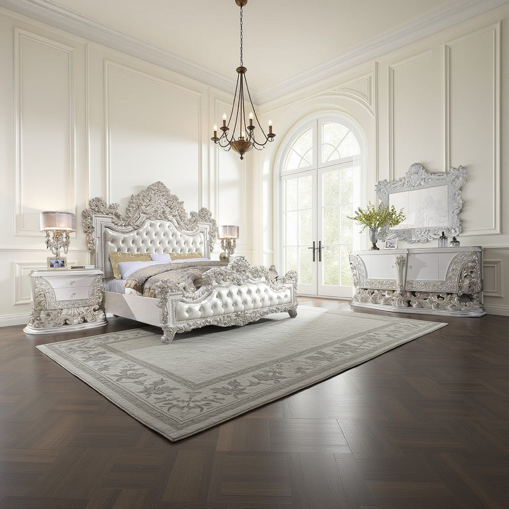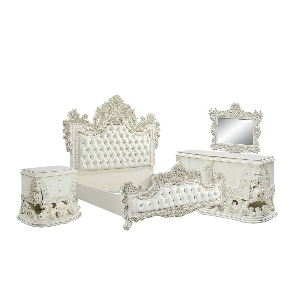 Bo Four Piece Full Bedroom Set, Baroque Style, White Faux Leather Uphosltery