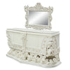 Immerse yourself in luxury with this Bo four piece full bedroom set, a stunning blend of Baroque elegance and modern comfort. The full-size bed features an ornate acrylic diamond-tufted headboard and a stylish footboard, both upholstered in white faux leather for a regal touch. A matching two-drawer nightstand and wide dresser with a mirror offer ample storage, with felt-lined, self-closing drawers adorned with antique-style knobs. Intricate carvings and curved bases complete its timeless appeal.