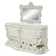• Matching two drawer nightstand, a wide dresser, and a mirror showcase solid curved bases and decorative carvings, enhancing the antique appeal