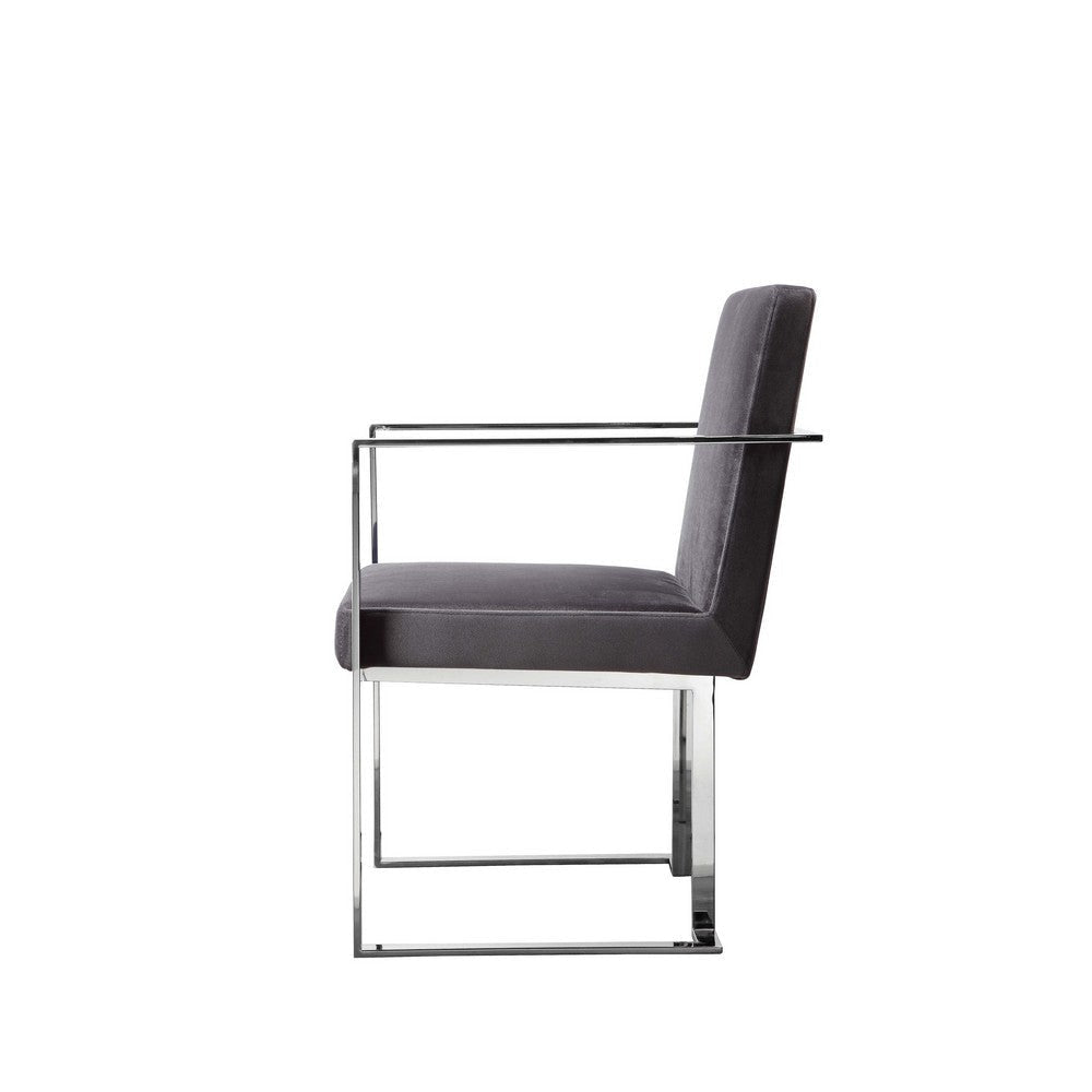 Sink into style and upgrade your favorite relaxation space with our Boly dining armchair. This modern statement piece features plush gray velvet upholstery over soft foam cushioning. Its high-polished chrome steel frame features open square-shaped legs, offering luxurious comfort and contemporary elegance. Check out our Boly collection for more options.