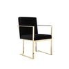 Our elegant modern Boly dining armchair epitomizes style and comfort with its sleek design. Adorned in smooth black velvet, its cushioned seating ensures a plush, comfortable experience at your dining table or as an accent chair.. It is adorned with a charmingly lustrous gold hue over a stable, luxurious, cantilevered steel base. Check out our Boly collection for more.