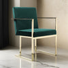 Our elegant modern Boly dining armchair epitomizes style and comfort with its sleek design. Adorned in smooth green velvet, its cushioned seating ensures a plush, comfortable experience at your dining table or as an accent chair. It is adorned with a charmingly lustrous gold hue over a stable, luxurious, cantilevered steel base. Check out our Boly collection for more.