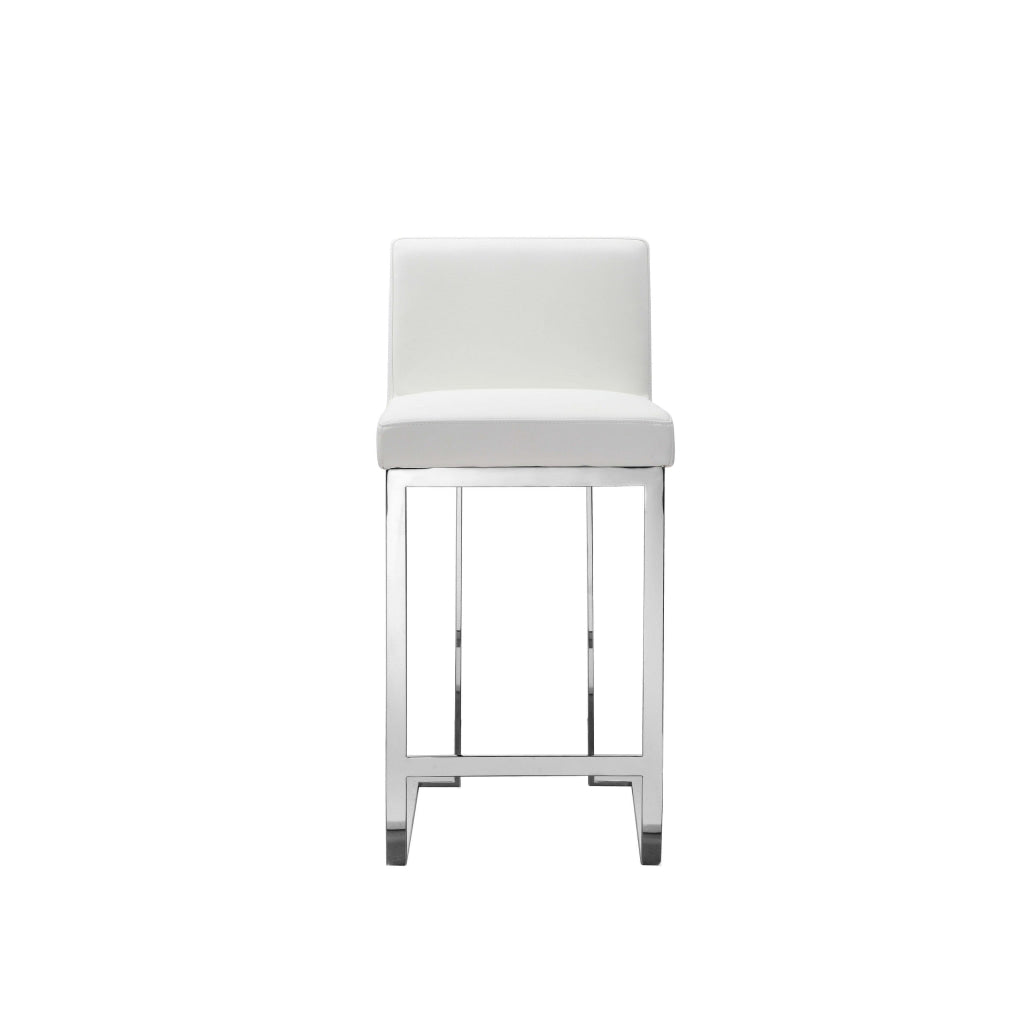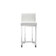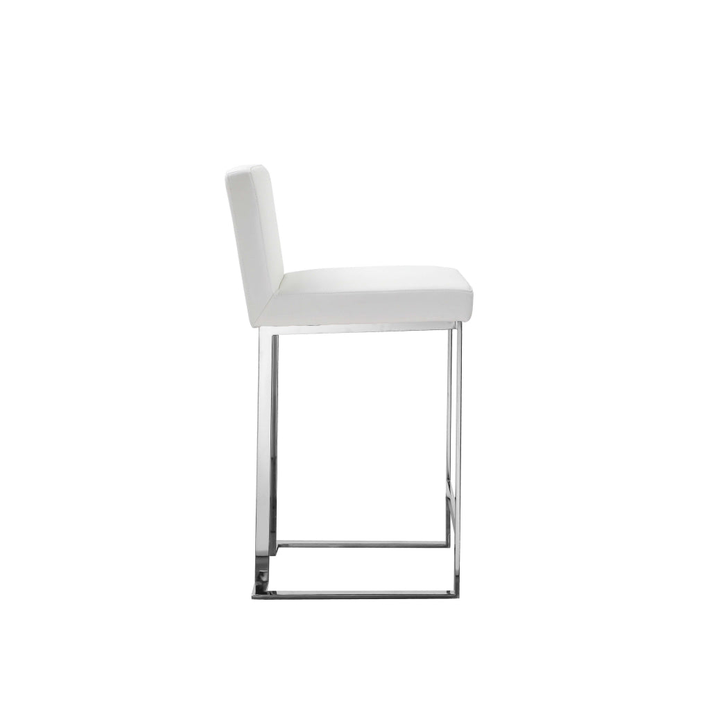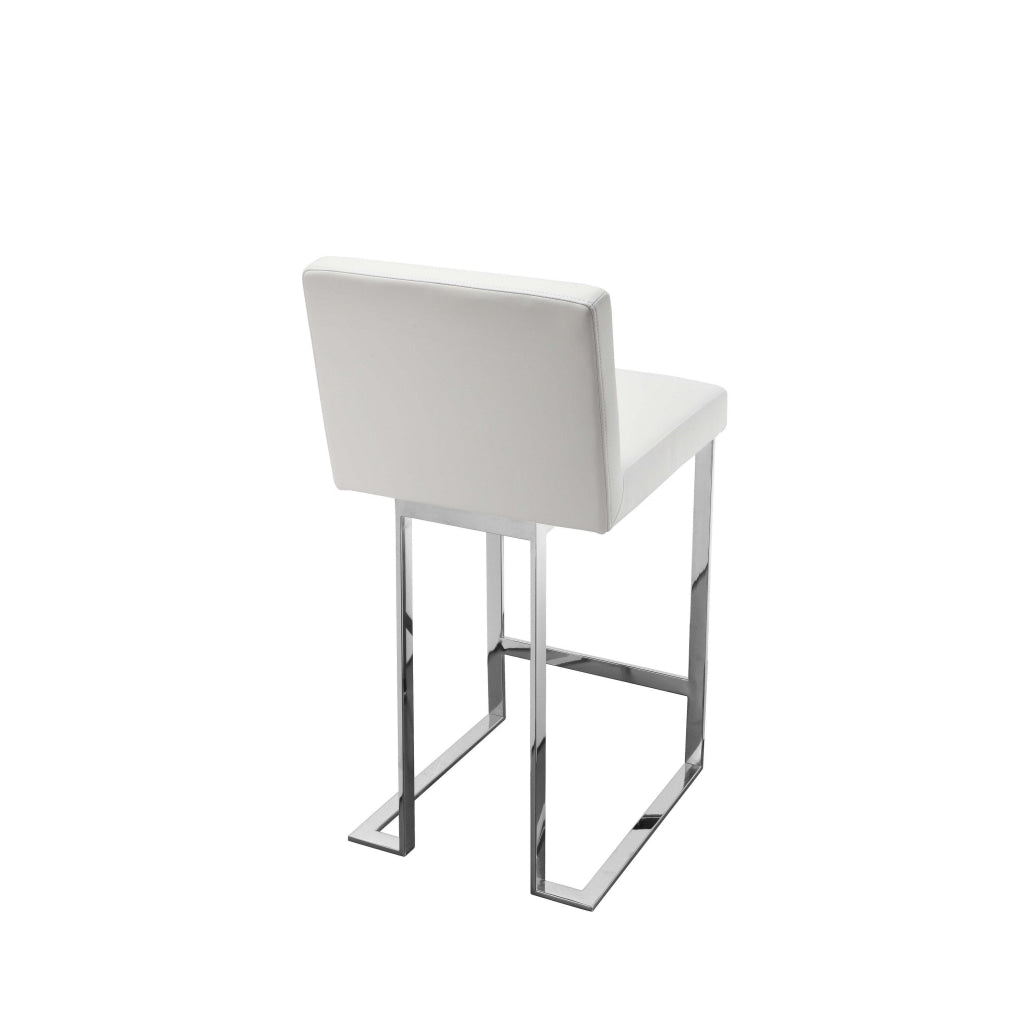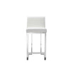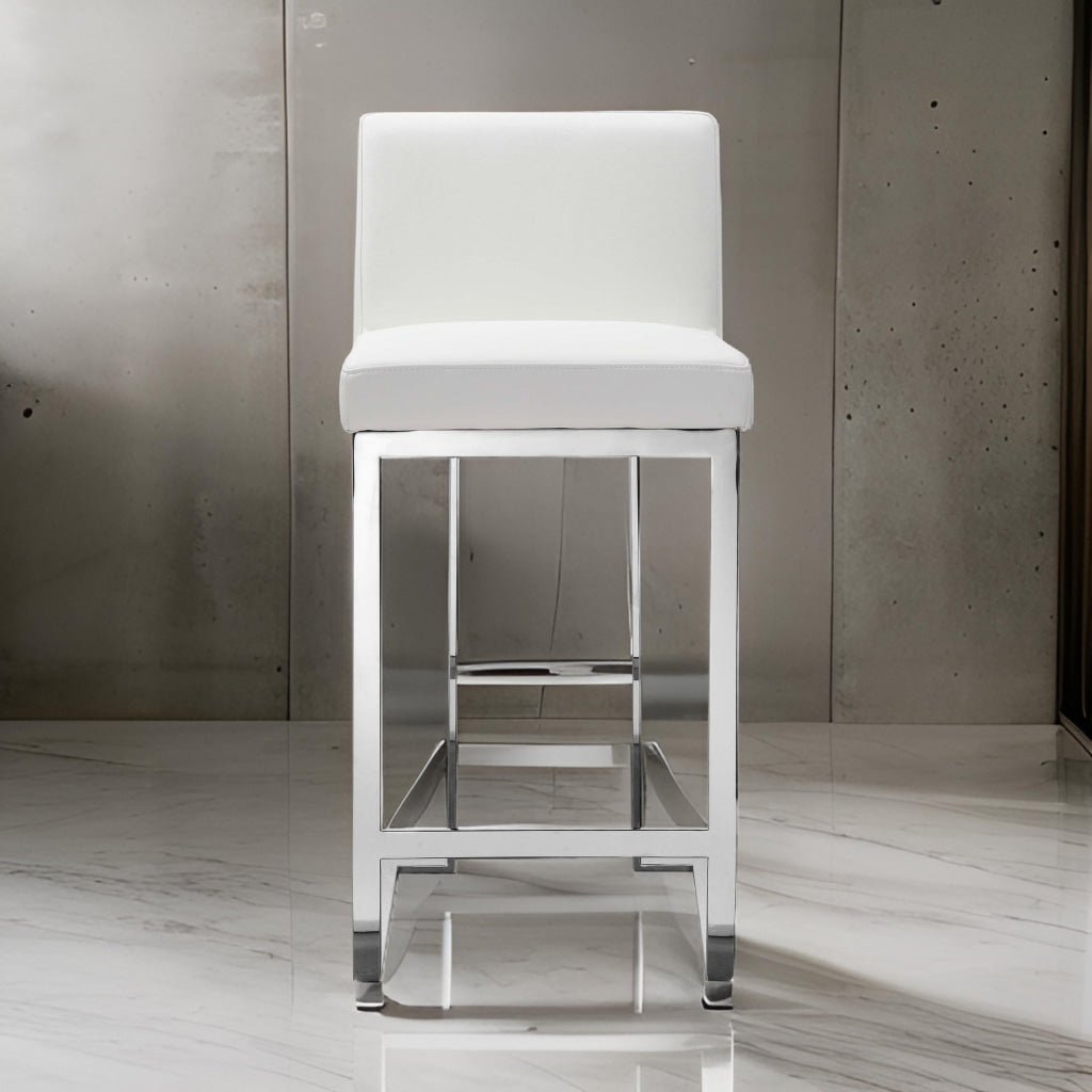 Level up any kitchen island or counter height table with this counter stool chair from our Boly collection. This modern gem features a polished chrome frame with rectangular legs, plush white faux leather upholstery, and a relaxing footrest, creating a stylish and comfortable seating experience for holiday gatherings or cozy evenings alike. Check out our Boly collection for more options.