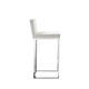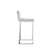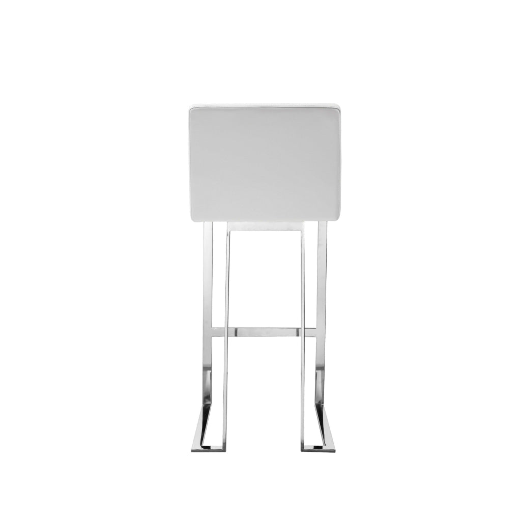 Level up any bar height table with this barstool chair from our Boly collection. This modern gem features a polished chrome frame with rectangular legs, plush white faux leather upholstery, and a relaxing footrest, creating a stylish and comfortable seating experience for holiday gatherings or cozy evenings alike. Check out our Boly collection for more options.