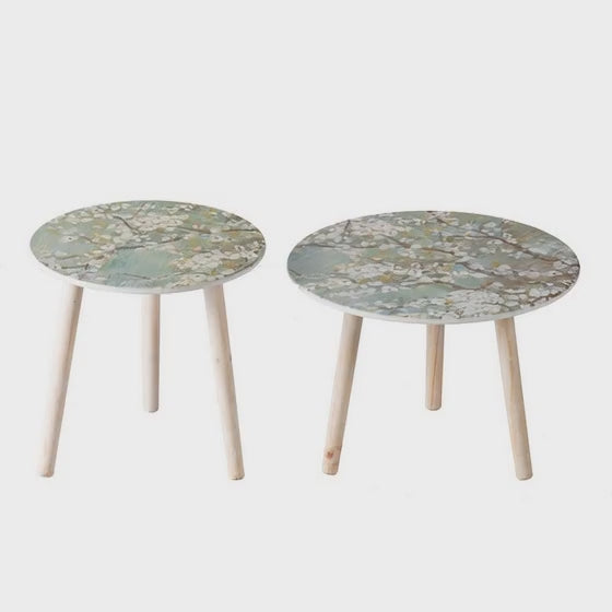 Introduce a stunning visual impact to your space with this elegant set of two side tables. Crafted from quality MDF, these tables feature watercolor style floral cherry blossom tops, adding a touch of artistic flair. The set includes both a small and large table, with blue and natural tones on top and base that enhance its clean, fresh aesthetics. Check out our Byle collection for more.