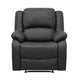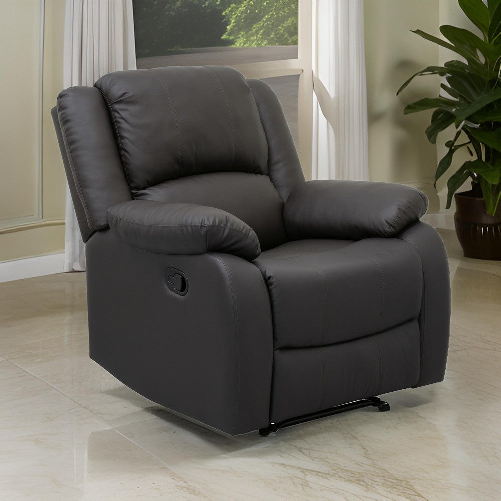 This recliner chair blends modern style with timeless comfort. Its sleek design and polished black faux leather upholstery offer visual appeal, while the tab pull manual reclining motion invites you to unwind effortlessly. Find your personalized haven of relaxation and explore more versatile living room furniture options by searching our Chris collection.