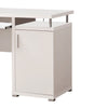 This white computer desk combines a sleek, contemporary look with practical storage for your home office. It features two storage drawers in one pedestal, one cabinet with two shelves inside in the other pedestal, and a keyboard tray.