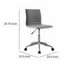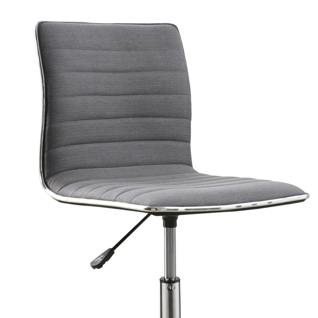 The back and seat of this Contemporary Mid-Back Desk Chair is upholstered in Gray fabric and frame of the chair is a bright chrome. This charismatic design features a pneumatic gas-lift adjustable height mechanism, channel-tufted polyester upholstery, and a gently curved mid-back seat. The chair has smooth rolling multi-surface dual wheel casters that provides easy access to your surrounding work area.