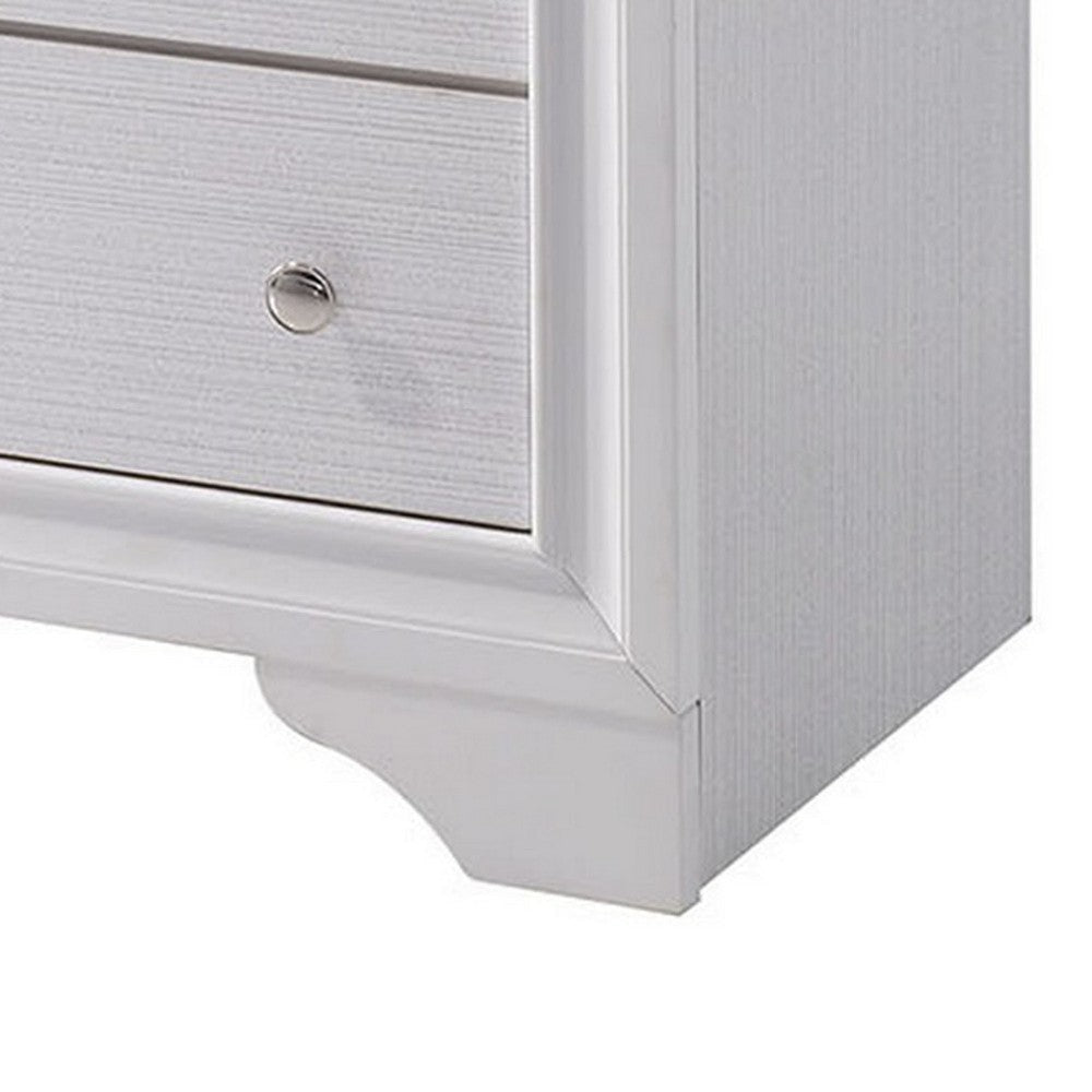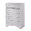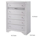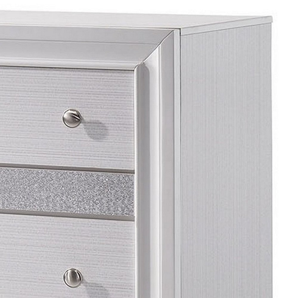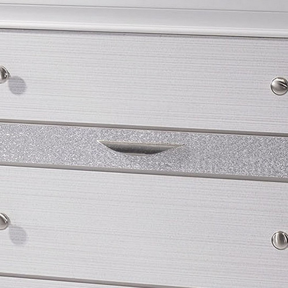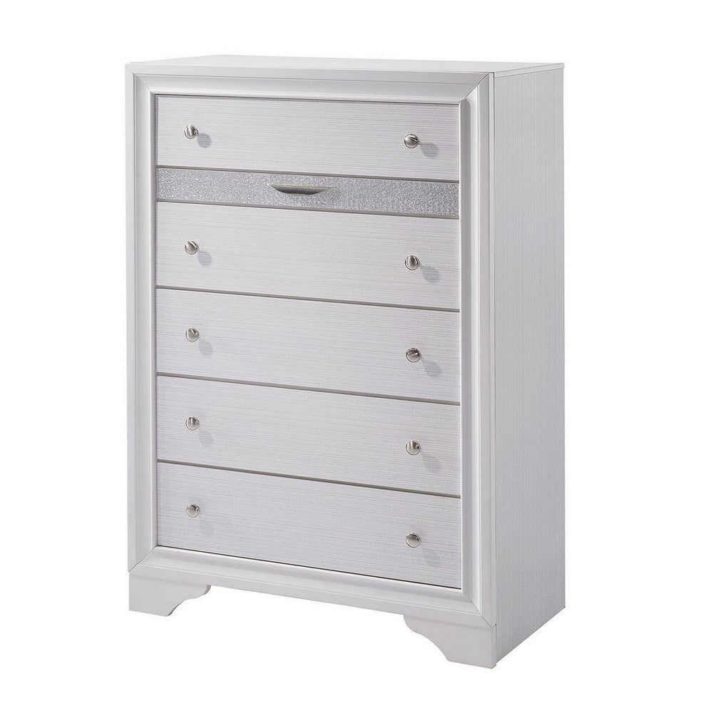 Intensify your living space with a charm to your bedroom with this absolutely stunning chest piece in a white finish. Crafted from wood, this gorgeous piece features built in jewelry drawers with silver accents along with five other drawers that provide ample storage for your favorite items. Decorate the top with your most cherished photos, paintings or decor items, this chest is versatile and makes a statement of its own.
