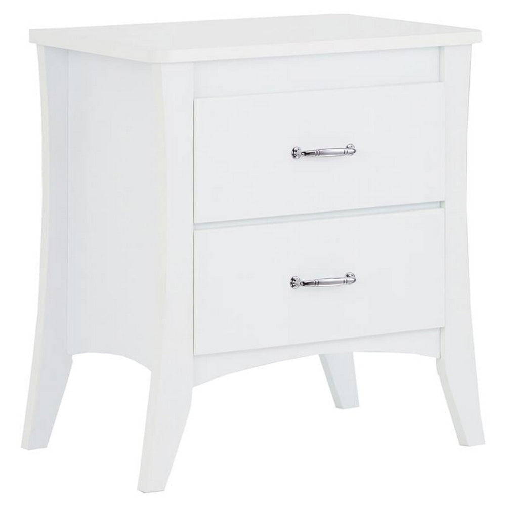 This Babb collection nightstand is a convenient addition to your bedroom as it not only provides extra storage space, but the contemporary simple style, white finish works with any existing decor. This nightstand is crafted from wood and supported by tapered legs, is both trendy and functional. The Nightstand has 2 storage drawers with metal handle bar that can be used to store books or magazines or other essentials. Use the top surface to place a lamp on, or use it to display a few accessories for added style. Keep your bedroom essentials within arm?s reach with the Babb Nightstand.