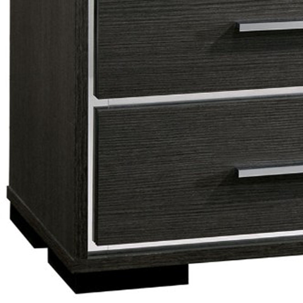 Enhance your bedroom decor by giving some extra storage space with this decorative night stand. Constructed from wood and metal, this night stand features three storage drawers with metal bar handles. Enough spacing of drawer will allow you to store all bedtime essentials that you would like to keep close by your reach. This night stand features dark gray finish with chrome trim inserts and supported by bracket feet. Use the smooth top of night stand for decorative purposes. Bring this furniture piece to give bedroom an instant makeover.