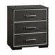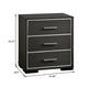 • It features three spacious drawers with metal bar handles and accented by chrome trim detail.