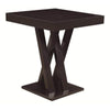 This modern dining table is a great way to set aside a dining space in an urban home or apartment with an open floor plan. The modestly-sized table is counter height, and features Cappuccino( Brown) wood finish and a unique pedestal base with interlocking wood slats.