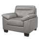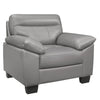 Elevate your living space with a touch of modern luxury today. This sleek accent chair features light gray top-grain leather and faux leather upholstery, offering a rich and inviting feel. The chair features a sturdy solid wood and plywood frame, supported by exposed legs with a sophisticated faux wood finish. Check out our Danny collection for more options.
