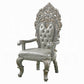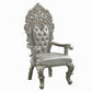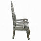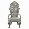 Elevate your dining area with this set of two armchairs, featuring beige synthetic leather upholstery and a champagne finish. Adorned with crown details and crystal like button tufting, these chairs offer both comfort and luxury. Their hollow carving and upholstered design make them a standout addition to any elegant dining space. Check out our Dove collection for more options.