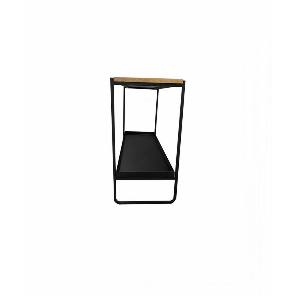 Organize your entryway, living room, or bedroom with our Evon console table. The versatile two tier design features a spacious rectangular top and a tray style lower shelf made of natural brown wood veneer. This piece is supported by sleigh style premium black metal legs that add modern elegance to any living space. Check out our Evon collection for more options.