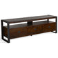 Upgrade your entertainment space with this TV media entertainment console, designed with dark brown mahogany solids and veneers and made to accommodate large TVs while providing ample storage for your media essentials. Its rustic charm, highlighted by rough sawn distressing and a powder coat black metal finish, enhances any room's aesthetic. Check out our Flint collection for more.